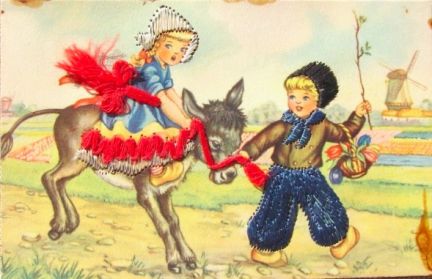 | old post card donkey burro riding saddle saddeld |